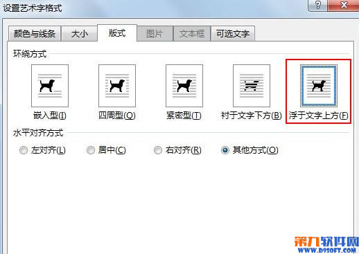 5.右擊文字,從右鍵菜單中選擇設置藝術字格式,彈出對話框,選擇浮于文字上方。