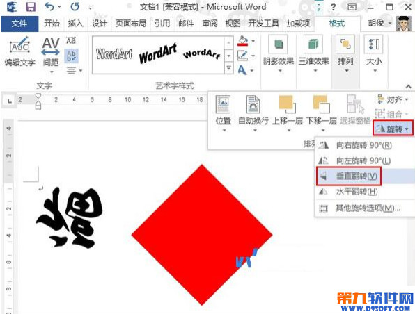 6.在格式--排列--旋轉選項中,將文字垂直翻轉,形成倒立的樣子。