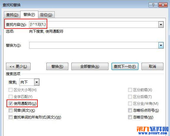 ?、趩螕舾喟粹o之后,勾選使用通配符。在查找內容中輸入: [!^13]{1,}