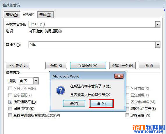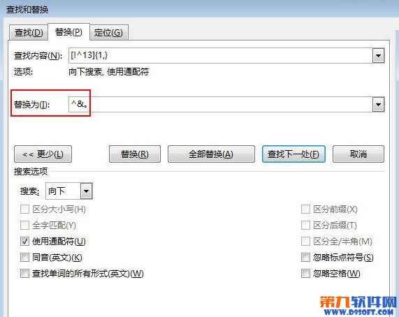 ?、傥覀儐覹ord2013,打開文檔,發現末尾處都沒有句號。按下鍵盤上的Ctrl+H,打開替換對話框?! 、趩螕舾喟粹o之后,勾選使用通配符。在查找內容中輸入: [!^13]{1,} ③在替換為里面輸入: ^&。 ?、軉螕羧刻鎿Q按...