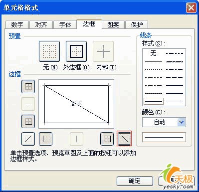 步驟3:選擇A1單元格,選擇“格式|單元格”菜單項,在“單元格格式”對話框中選擇“邊框”選項卡,對“邊框格式”進行斜線設置。如圖6所示。