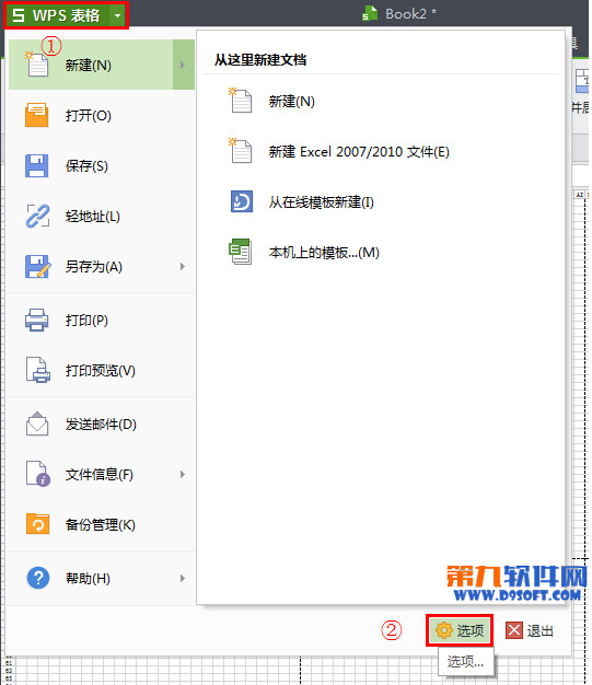 ①點擊WPS表格左上角的【WPS表格】菜單按鈕,找到【選項】按鈕;