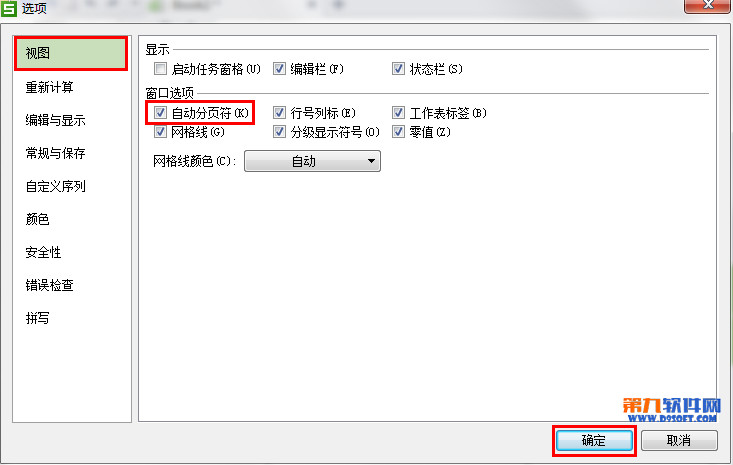 ②通過【選項】按鈕打開【選項】窗口后,在左側的菜單中選擇【視圖】,然后去掉【自動分頁符】的勾選,點擊【確定】