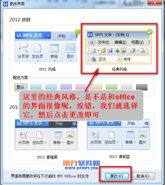 “更換界面”的圖標,點擊這里,這時彈出更換界面的對話框,我們選擇“經(jīng)典風格”,點擊更改!