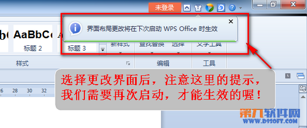 步驟3:這時看到提示,我們關(guān)閉WPS文件,重新啟動WPS文檔,看看效果,熟悉吧!沒錯,界面已經(jīng)掉換回來咯。