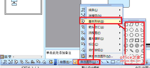 4、我們把繪圖欄打開之后,里面有許多基本的繪圖所需要的圖形。也可以直接選擇流程圖,直接選擇流程圖和我們自己用圖形拼裝起來的流程圖最大的不同就是,選擇流程圖選項之后所做成的流程圖可以進(jìn)行自我修正。