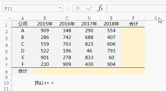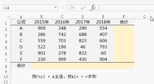 其實你可以更快,按Ctrl + A 全選表格,按Alt + = 求和。在表格大時這個方法優勢明顯。