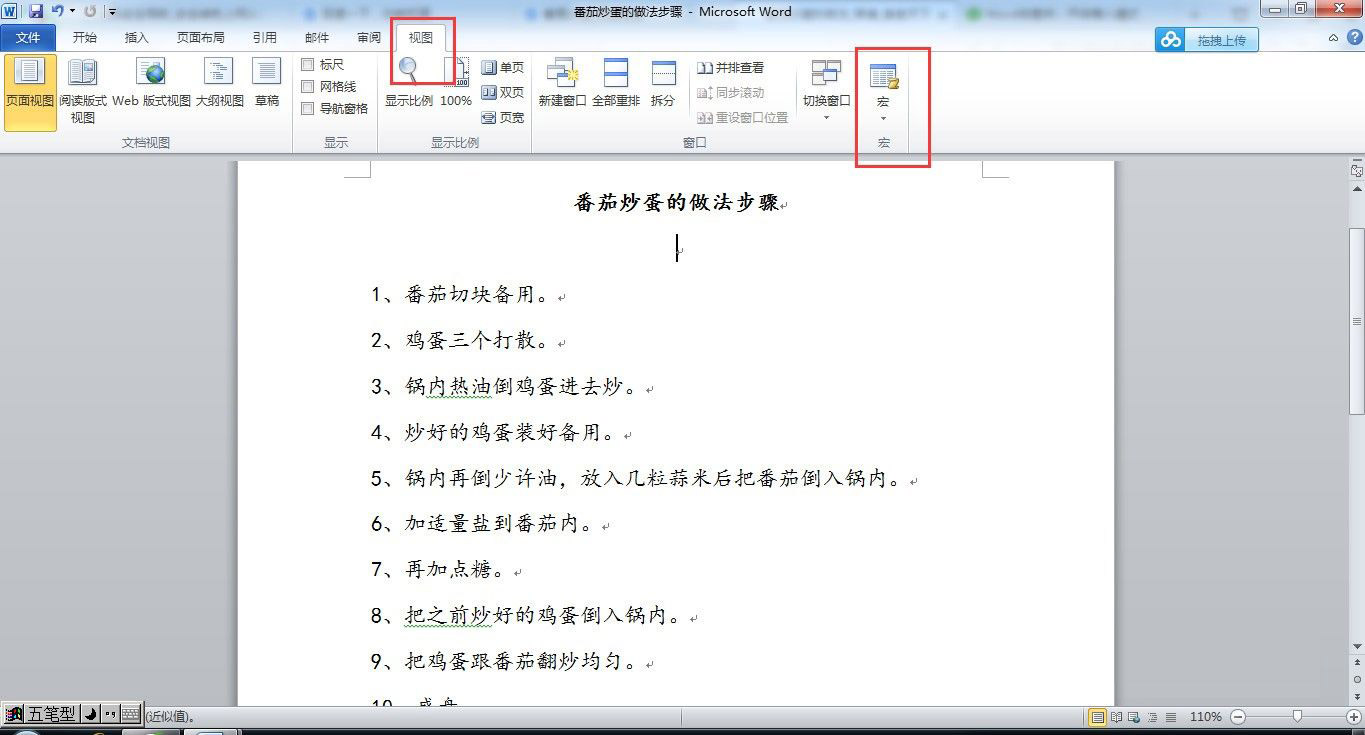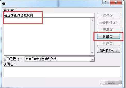 一、首先,我們進入《視圖》中的《宏》,點擊《宏》。在彈出的對話框中我們將名稱輸入一下,這里我輸入的是《番茄炒蛋的做法步驟》,你們可以自行修改。輸入完成后點擊《創建》按鈕。