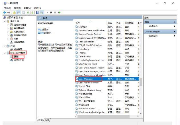 2,進入計算機管理界面后,依次展開“服務和應用程序——>服務”,在界面右側找到“User Manager”并雙擊打開。