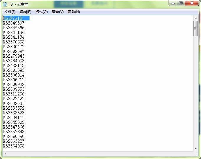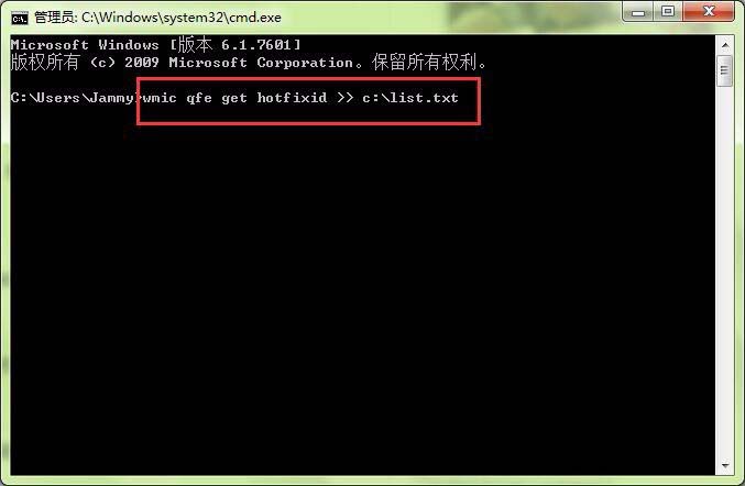 2、在管理員模式下運行cmd,輸入wmic qfe get hotfixid >> c:\list.txt,敲下回車鍵