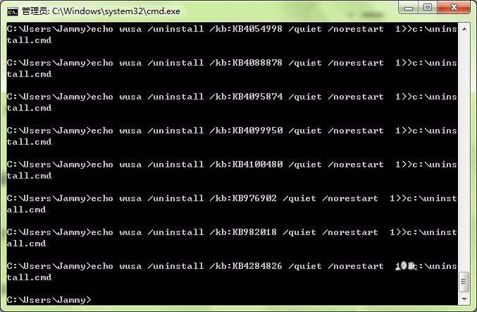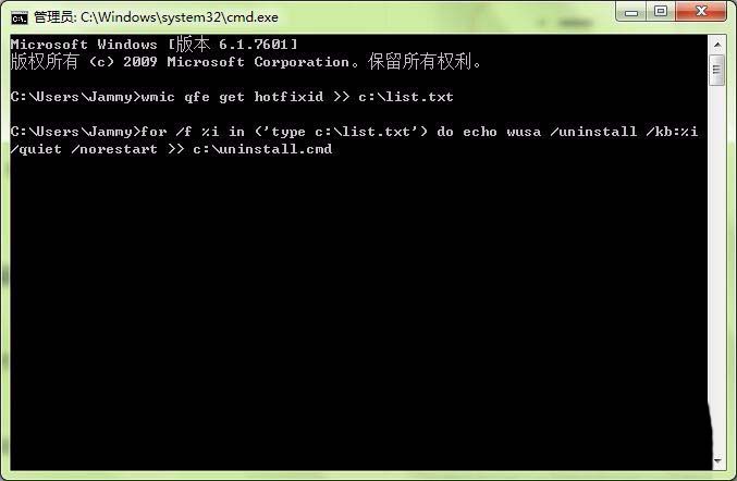 6、再次回到原來管理員模式下的cmd運行窗口,輸入以下內容,然后敲回車鍵。for /f %i in ('type c:\list.txt') do echo wusa /uninstall /kb:%i /quiet /norestart >> c:\uninstall.cmd