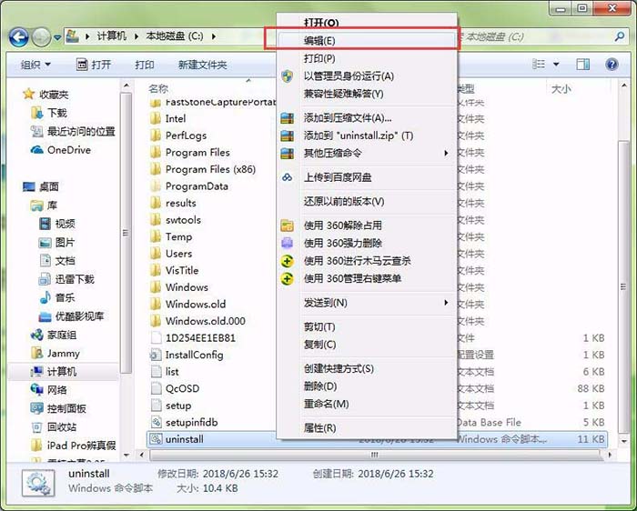 8、再次回到系統C盤,找到名為uninstall的cmd文件,右鍵單擊鼠標,選擇【編輯】