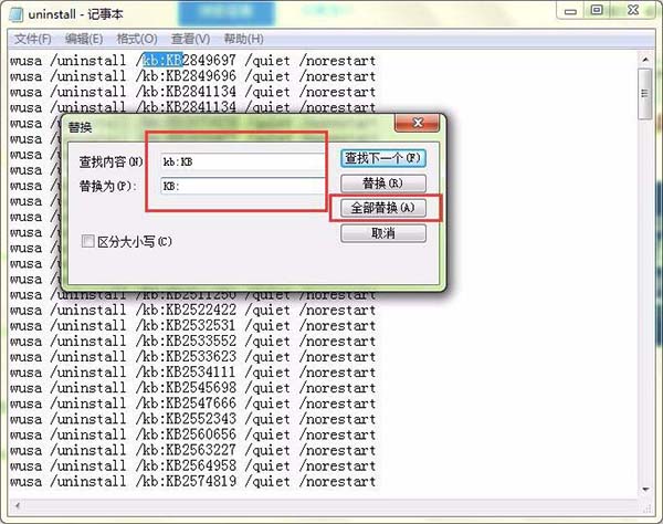 11、如下圖所示,把所有kb:KB替換為KB:。然后,點擊【全部替換】