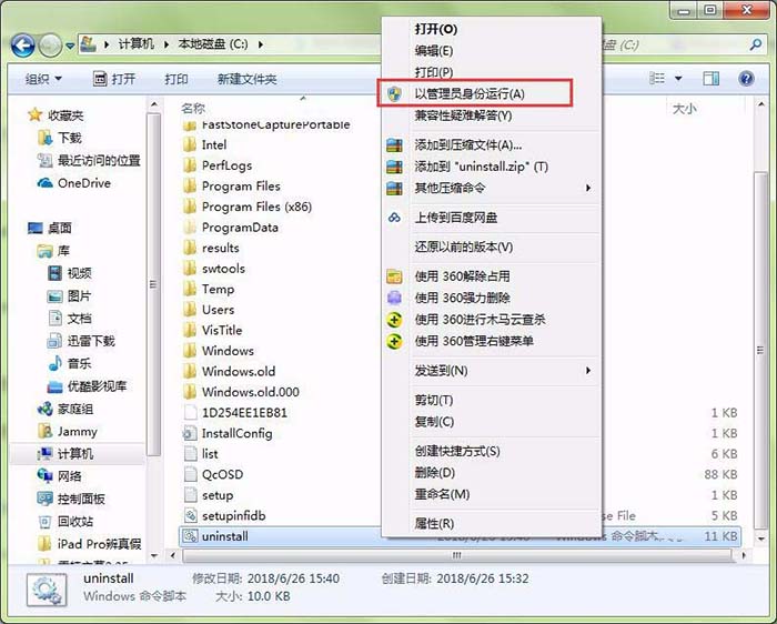 13、最后再回到系統C盤,在剛剛編輯過的uninstall的cmd文件上面,右鍵鼠標,選擇【以管理員身份運行】或者直接雙擊鼠標打開運行