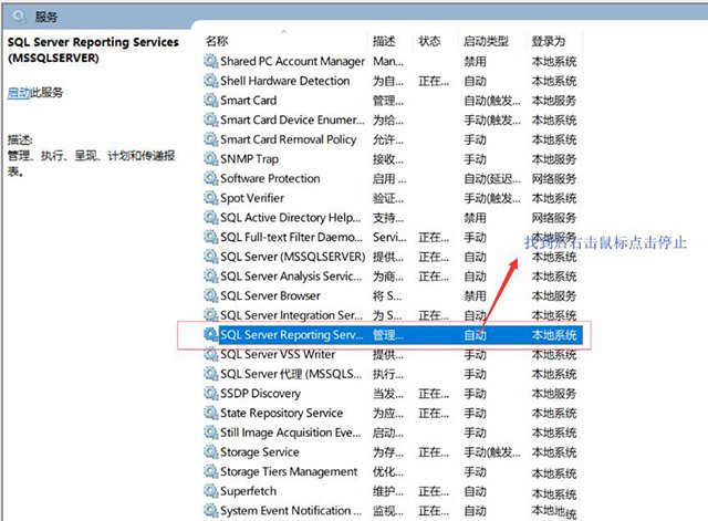 2、在服務(wù)中找到“sql server reporting services”的服務(wù),并鼠標(biāo)右鍵點(diǎn)擊停止。