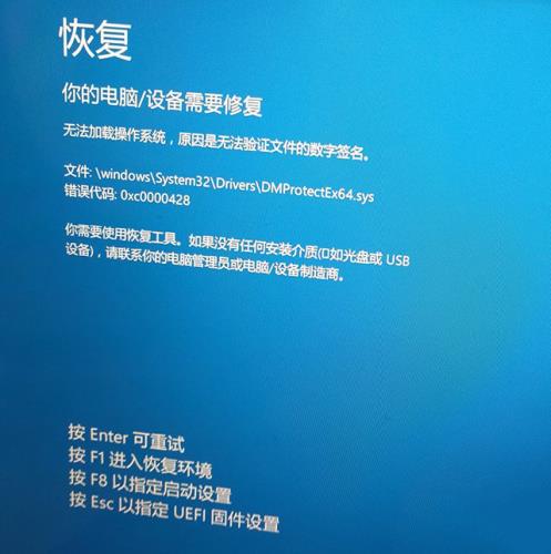 不過重啟之后,依然無法進入系統,而是提示了恢復,你的電腦/設備需要修復,無法加載操作系統,原因是無法驗證文件的數字簽名,文件:WindowsSystem32DriversDMProtectEx64.sys,錯誤代碼:0xc000048,如下圖所示。