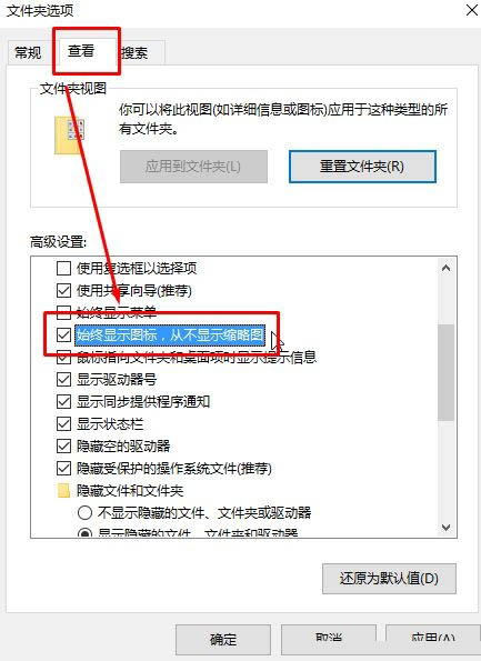2、切換到【查看】選卡,在下面勾選【始終顯示圖標,從不顯示縮略圖】點擊確定保存設置即可。