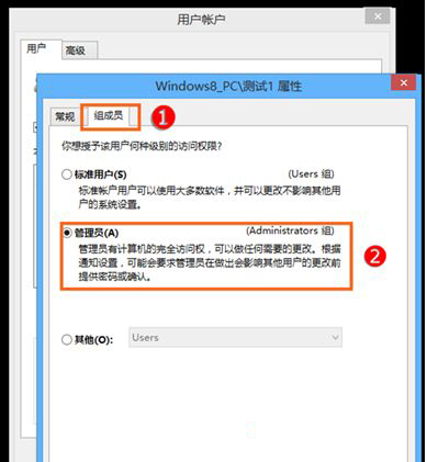 3、在組成員標簽中將賬戶分為管理員,然后點擊確定退出即可。之后使用新賬戶登錄就可以使用管理員權限了。
