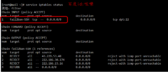 可以通過(guò)service iptables status 如圖(如果有其他組件如fail2ban也會(huì)調(diào)用防火墻規(guī)則) 后面就是規(guī)則鏈