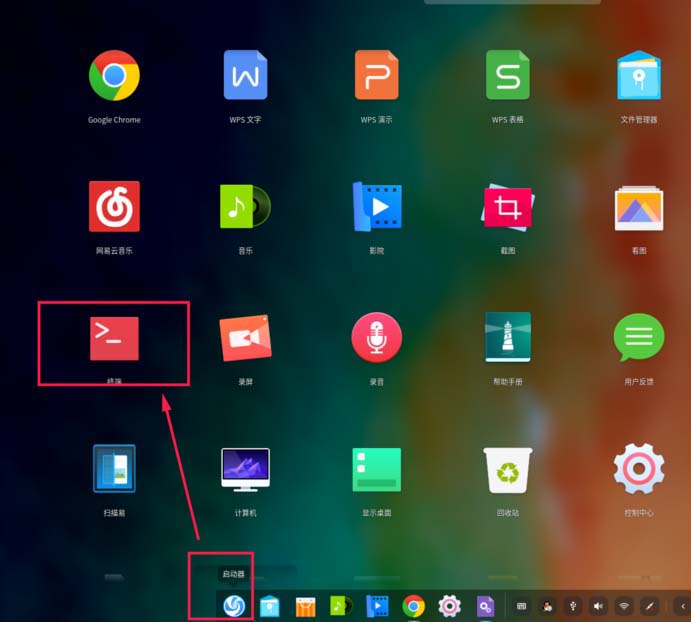 1、首選點擊啟動器,然后打開deepin的終端,終端的位置和mac os系統有些類似,與windows稍微有一些不同。