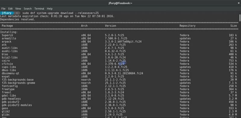 $ sudo dnf system-upgrade download --releasever=25 --allowerasing