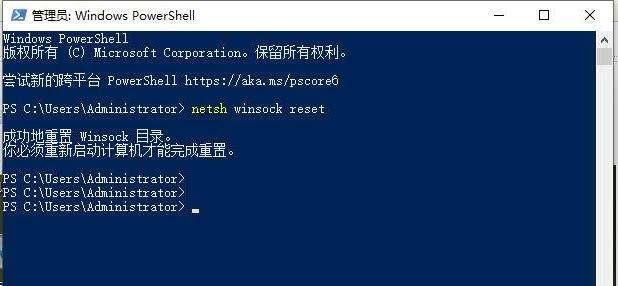 2、我們在Windows PowerShell窗口中輸入“netsh winsock reset”命令,并回車鍵確定,這時會提示成功地重置Winsock目錄,你必須重新啟動計算機才能完成重置。