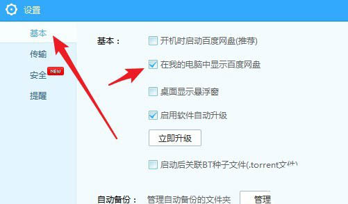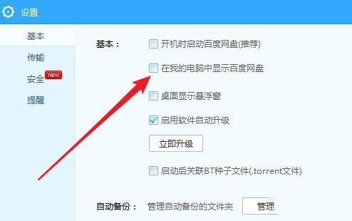 5、在右側(cè)窗口找到并取消,在我的電腦中顯示百度網(wǎng)盤前面的勾選。