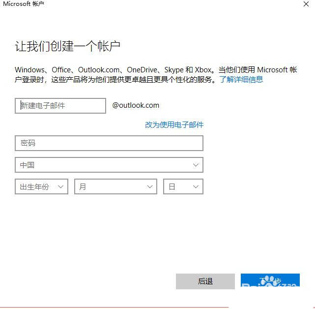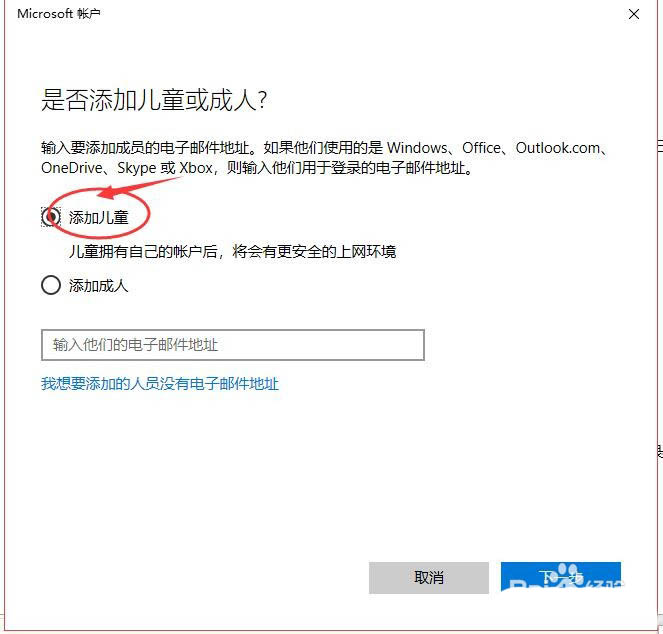 7、在彈出的窗口中,點擊“添加兒童”的選項,如果有兒童的郵箱話,就在輸入框里填寫兒童的電子郵箱地址,當然也可以選擇“我想要添加的人沒有電子郵箱地址”選項,選擇這個選項話win系統會自動聯網給你創建郵箱賬戶。