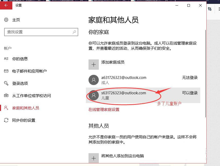 6、在打開的賬戶設置頁面,點擊左邊導航菜單里的【家庭和其它人員】標簽,在它右邊的子頁面中點擊“添加家庭成員”前小方框里的“+”號來新增兒童賬戶。