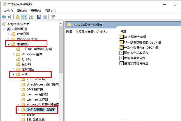 2、彈出對話框選擇:管理模板→網絡→Qos數據包計劃程序;