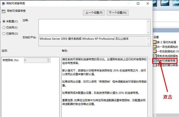 3、雙擊右側“限制可保留寬帶”彈出對話框,可以看到默認設置為未配置,下面的說明顯示:如果禁用或未配置此設置,則系統使用默認值為20% 的連接帶寬,因此電腦是被限制了20%的寬帶;