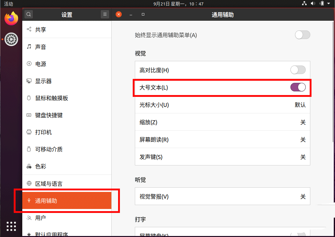 5、我們還可以選擇左邊的 通用輔助,在右邊開啟 大號(hào)文本。