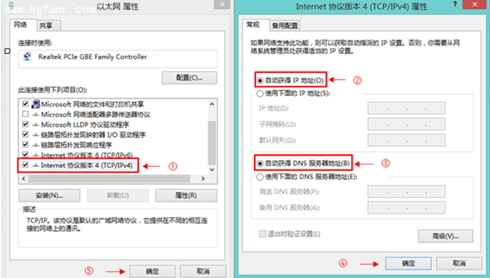 ▲雙擊Internet協議版本4(TCP/IPv4),把IP和DNS全部選擇自動獲得,點擊確定。
