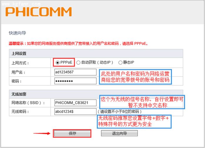 ▲按照圖片文字指示設置好寬帶賬號密碼及無線名稱以及無線密碼