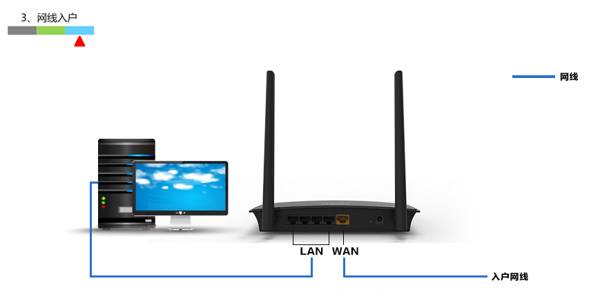 一、連接方法1、首先使用一根網線連接路由器的LAN與電腦的網口(如您電腦目前有網線連接著,請先拔出掉),連線如圖。2、接通斐訊路由器電源(除路由連接電腦的網線其余的網線暫時先不要接)3、接通路由...