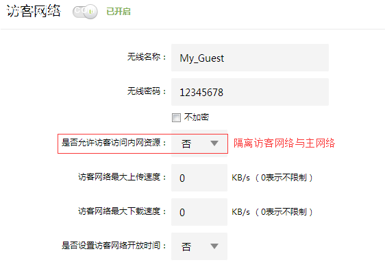 推薦使用訪客網絡功能,主網絡只對親友開放,對于一般的來訪者只需告訴他訪客網絡的無線名稱和密碼。請登錄到路由器的管理界面,點擊 高級設置 >> 無線設置 >> 訪客網絡,開啟訪客網絡,設置無線名稱與無線密碼,點擊保存,如下圖所示。