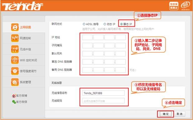 本文檔適用于騰達FH332使用固定IP、子網掩碼、網關、DNS上網的用戶
