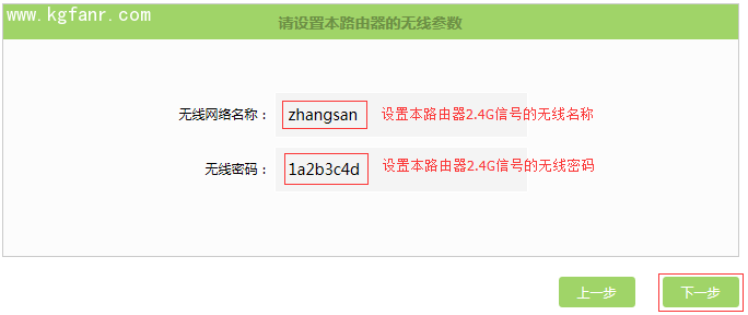 掃描并連接主路由器信號后,設置本路由器2.4G信號的無線網(wǎng)絡名稱和無線密碼,并點擊 下一步,如下: