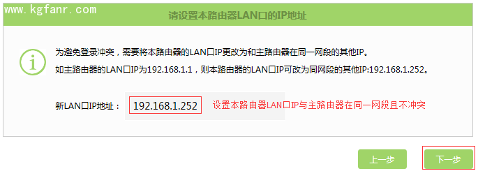 將本路由器的LAN口IP地址修改為與主路由器在同一網(wǎng)段且不沖突,并點擊 下一步,如下圖。