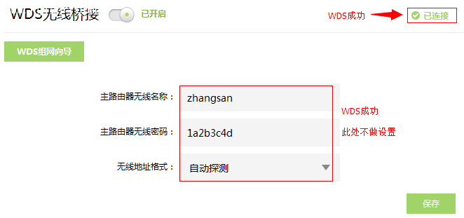 觀察右上角WDS狀態(tài),已連接 表示W(wǎng)DS橋接成功。如下圖:
