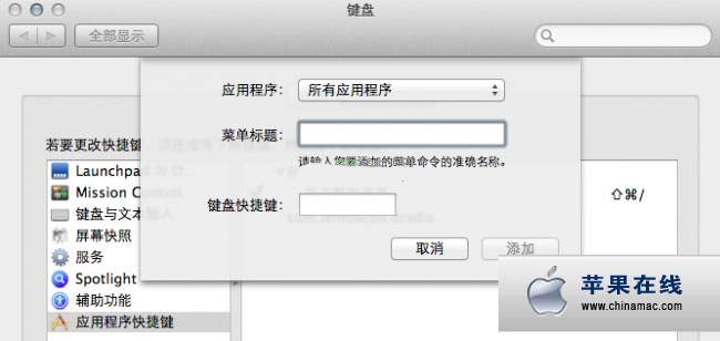 有些軟件的菜單命令項(xiàng)并沒有被開發(fā)者賦予快捷鍵支持,但通過OSX自帶的ApplicationShortcuts是可以為這些光棍兒安排對(duì)象的,來看步驟:1.打開程序,找到菜單欄里的目標(biāo)項(xiàng),記住它的完整名字2.打開系統(tǒng)偏好設(shè)...