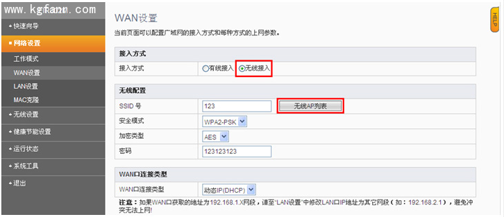 2、 進入【WAN設置】,選擇【無線接入】(如果沒有通過【快速向導】設置,此處是無法設置的)
