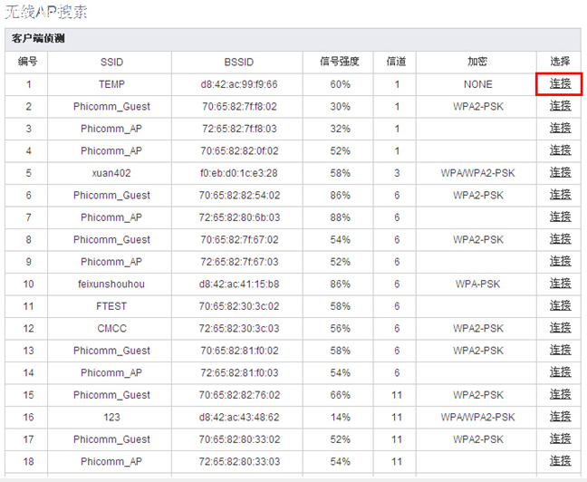 3、 點擊【無線AP列表】,會彈出如下窗口,表格里面顯示為附近的無線信號,選擇您想連接的無線信號,點擊【連接】。