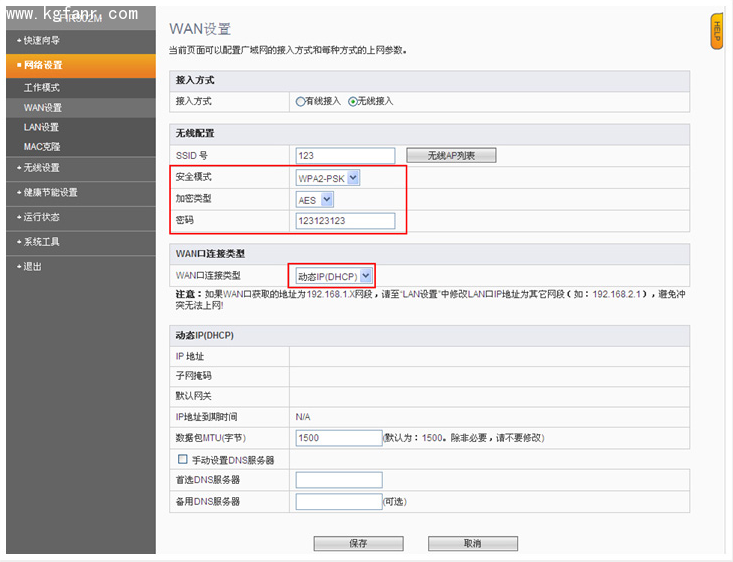 4、 點擊【連接】以后,【SSID號】會顯示所要連接的無線信號,【安全模式】、【加密類型】一般會自動的變成與上端設備一樣,只需要正確填寫上端無線信號的【密碼】。【WAN口連接類型】一般選擇【動態IP】即可,可根據需要選擇【靜態IP】,最后點擊【保存】。