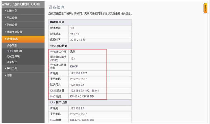 5、 保存以后點擊【運行狀態】,已獲取到上端設備分配地址,則表示設置成功,已可連接副路由器上網。