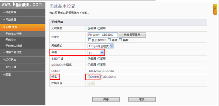 1. 無線設置。設置【網絡名稱(SSID)】,固定【信道】,調整【頻道帶寬】為20MHZ,然后保存。