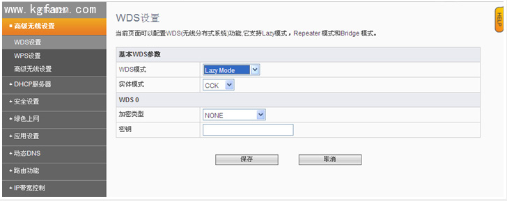 2. WDS設置。【WDS模式】選擇【lazy mode】(也可選擇【repeater】模式,【repeater】模式參考副路由器設置),其他不用修改,然后保存。