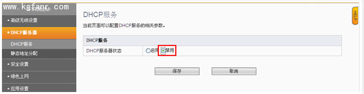 2. DHCP設置。禁用DHCP服務器。