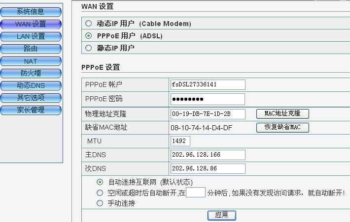 ◆確定之后,如下窗口(WAN為主要設(shè)置項)左邊欄會有九個選項.(系統(tǒng)設(shè)置,WAN設(shè)置,LAN設(shè)置,路由,NAT,防火墻動態(tài)DNS,其它選項,家長管理)點擊WAN設(shè)置,(以PPPOE為例),填上自己的帳號和密碼.不知道的可以向安裝部門索取(一般會在安裝時給的安裝盤的背面寫有)及MAC地址克隆
