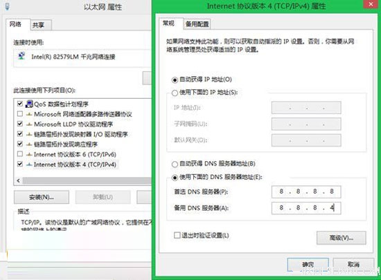 2、打開屬性,選擇TCP/IPV4,手動設(shè)置DNS服務(wù)器,例如8.8.8.8,8.8.8.4,確定后,生效